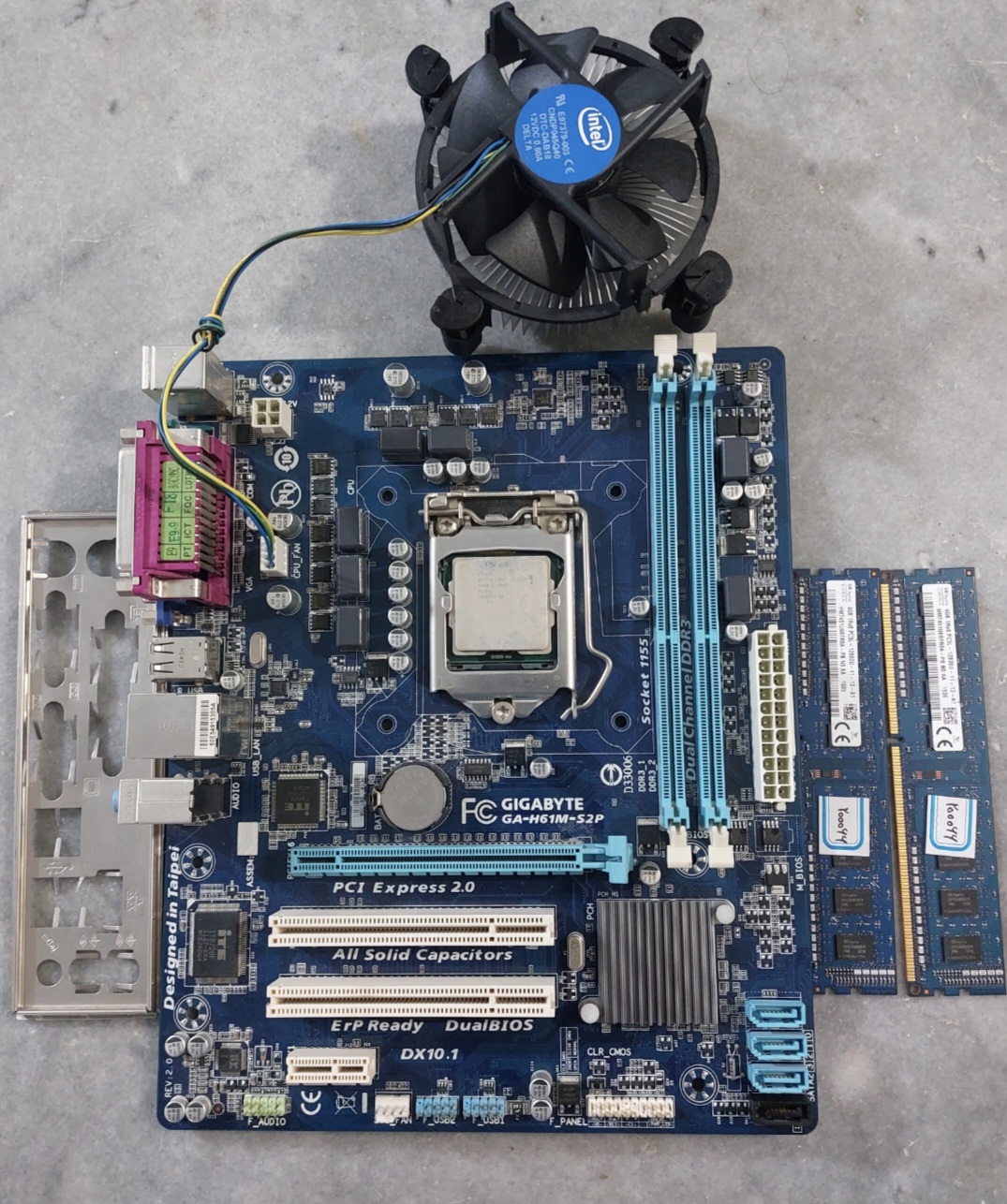 پنل پشت کیس و یک عدد باتری بایوس آکبند و یک عدد cpu i5 2400 و دو عدد رم ۴ گیگ اسکای هاینیکس اصلی استوک